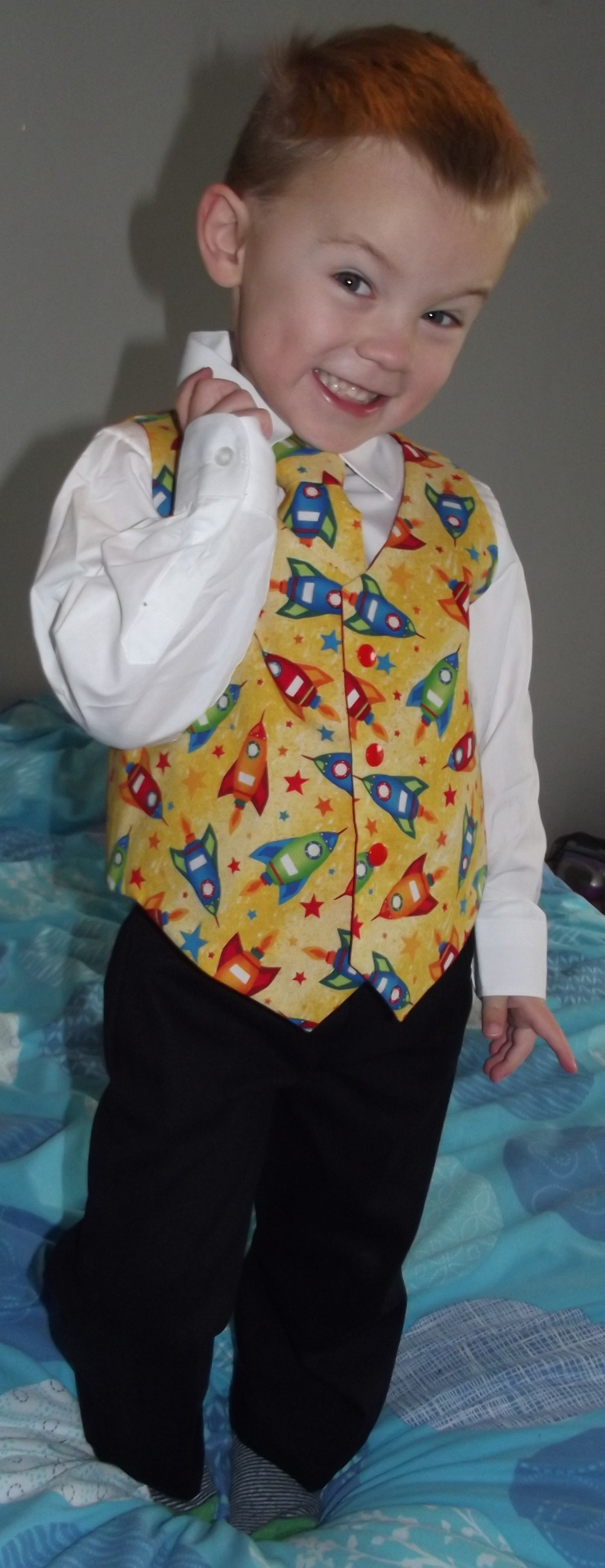 Looking cute in trousers, waistcoat and tie: