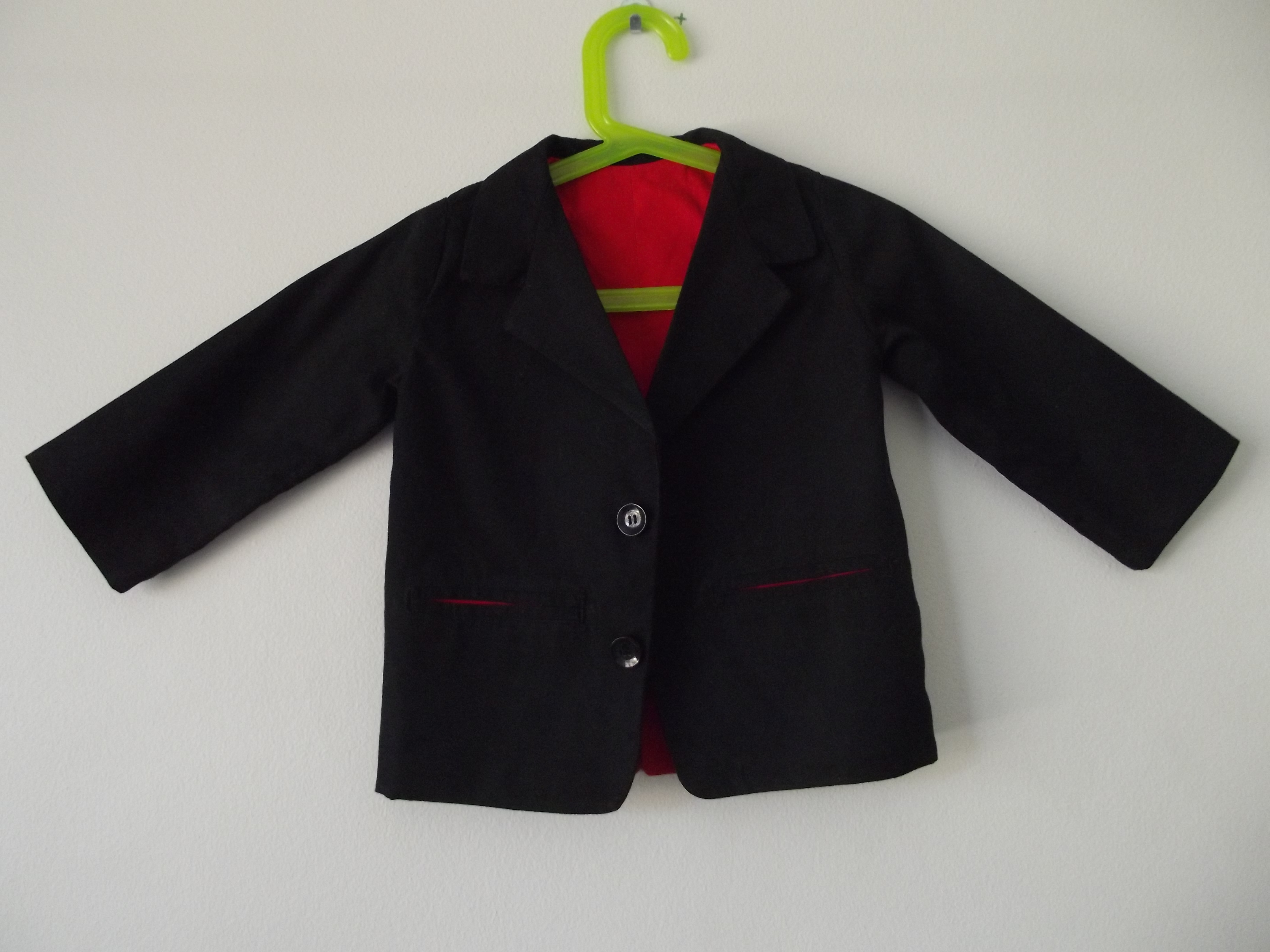 The jacket is made from red and black drill fabric using the Peek-a-Boo patterns Little Gentleman’s Suit Jacket pattern. I’m not sure whether I have a strangely proportioned child, or American children are just much bigger, but following the measurement table I made a size 2 and crossed my fingers the table was correct. It was!