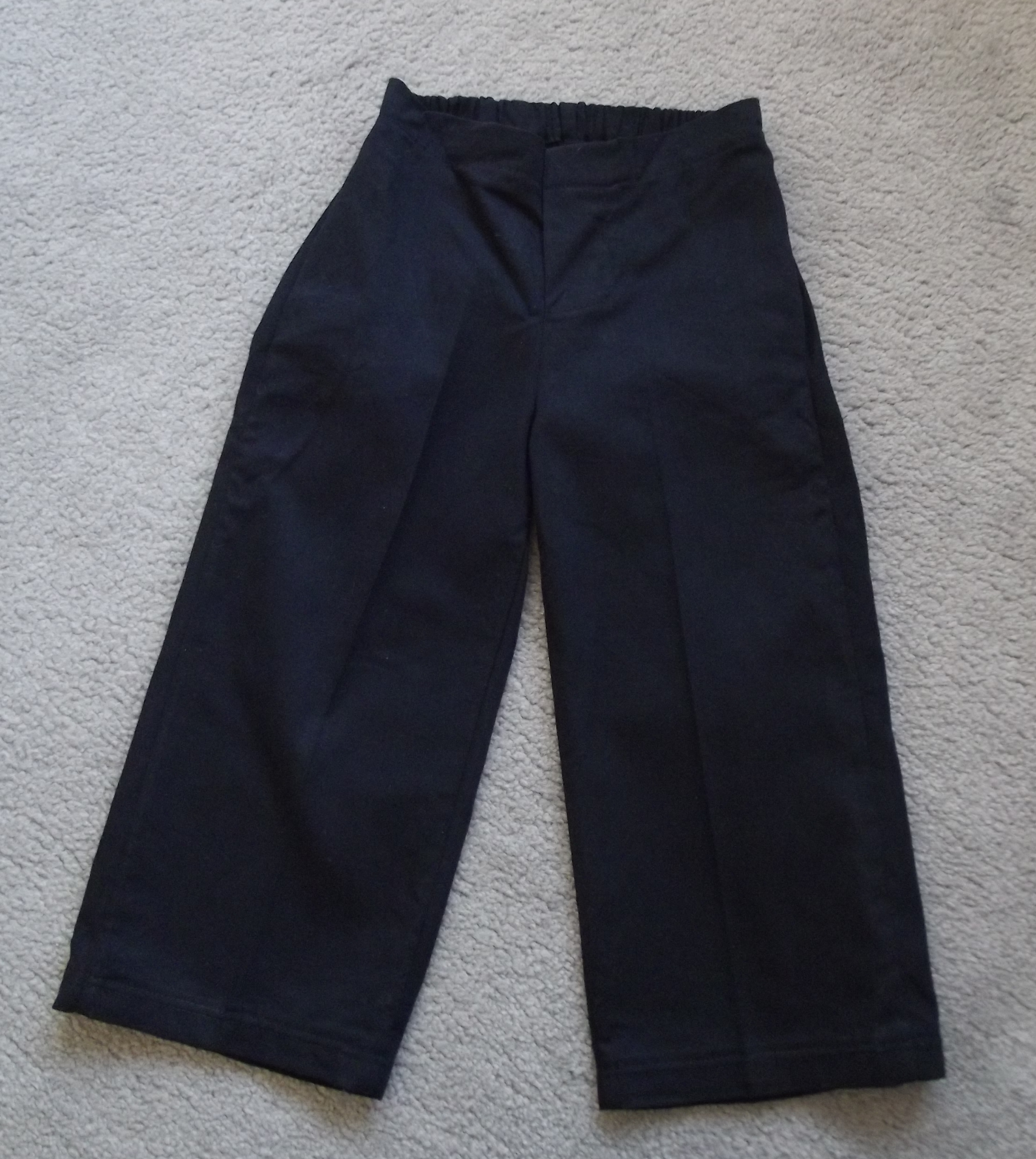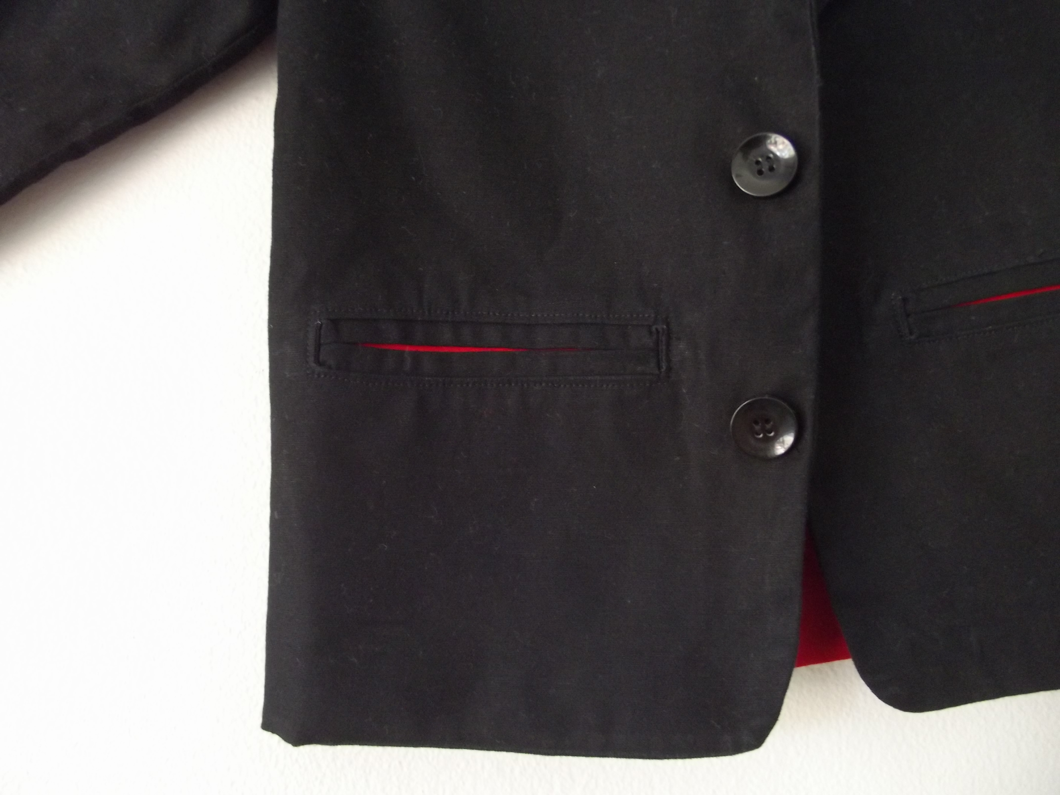 The trousers are made from the same black drill, and although you can’t see them in this photo, the pockets are made from the same red as the jacket lining. They too were from another Peek-a-Boo Patterns patten, called the Little Gentleman’s Pants.